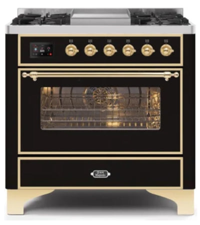 Vendor:ILVE Majestic II 36‑inch Dual Fuel Range with 6 Burners, Griddle, Warming Drawer (Triple Glass Door, Glossy Black, Brass, Liquid Propane) – UM09FDNS3BKGLP