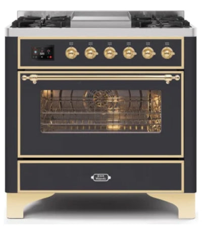 ILVE Majestic II 36‑inch Dual Fuel Range with 6 Burners, Griddle, Warming Drawer (Triple Glass Door, Graphite Matte, Brass, Liquid Propane) – UM09FDNS3MGGLP
