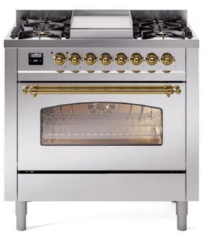 ILVE Nostalgie II 36‑inch Dual Fuel Range (Natural Gas, Triple Glass Door, Stainless Steel, Brass) – UP36FNMPSSG
