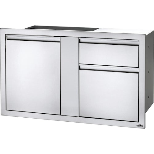 Customize your outdoor grill island with Napoleon built-in components. Measuring 36 inches wide by 24 inches high, this stylish stainless steel single door and waste bin drawer combo gives you the added storage that every outdoor kitchen needs. Anodized aluminum handles pair with soft closing hardware to provide durability and comfort. The seamless trim provides flexible and flawless installation. A slide-out drawer specifically built for trash bins presents a convenient solution to waste management when cooking or entertaining outdoors. These built-in storage components are ideal for any outdoor kitchen. Does not include trash bins.