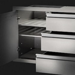 Customize your outdoor grill island with Napoleon built-in components. Measuring 42 inches wide by 24 inches high, this stylish stainless steel large single door and triple drawer combo gives you the added storage that every outdoor kitchen needs. Anodized aluminum handles pair with soft closing hardware to provide durability and comfort. The seamless trim provides flexible and flawless installation. You know you can expect quality when Napoleon has their named stamped subtly into the side of this sliding drawer. These built-in storage components are ideal for any outdoor kitchen.