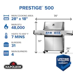 <h3>Sleek & Modern Stainless Steel Design</h3><p>The stainless steel Prestige 500 Natural Gas Grill is a dynamic evolution in grilling. Enjoy the sleek and modern design and the innovative cooking methods you already love with the evolved Prestige 500 Gas Grill.<p><h3>Reliable Starting with Enhanced JetFire Ignition</h3><p>Enhanced JetFire technology means a more reliable start every time you fire it up. This innovative ignition system eliminates the frustration of multiple attempts to get the grill going, allowing you to start barbecuing with ease and confidence.</p><h3>Thicker Grates for Better Heat Retention</h3><p>Thicker 8.5 mm cooking grates allow for better heat retention while still boasting Napoleon's iconic wave design.</p><h3>Updated & Angled Sear Plates for Even Cooking & Grease Management </h3><p>To further optimize heating efficiency, the sear plates are staggered and allow heat to move more efficiently, making cold spots & flare-ups a thing of the past while vaporizing those flavorful drippings. The sear plates are also angled, making grease management much easier & a porcelainized drip pan means no salt corrosion. </p><h3>More Grilling Options with Expanded Rotisserie & Sizzle Zone</h3><p>An expanded rotisserie burner and larger infrared Sizzle Zone provide enhanced performance so you can entertain larger crowds. The rotisserie burner is perfect for slow-roasting meats to perfection, ensuring evenly cooked roast every time. While hosting family gatherings or neighborhood cookouts, the larger Sizzle Zone offers a high-temperature area perfect for searing meats, locking in flavors and juices with precision.</p><h3>LED Knobs for Nighttime Grilling</h3><p>LED control knobs are ideal for nighttime grilling and feature a SafetyGlow so you know when the gas is running. </p><h3>Stowable Warming Rack & Hidden Tool Hooks</h3><p>To keep things nice & tidy when not in use, you can stow the warming rack, and hidden tool hooks provide even more extra prep space. </p><h3>Heavy-Duty Castor Wheels for Easy Mobility</h3><p>Improved heavy-duty castor wheels allow you to more easily relocate the grill when needed.</p>