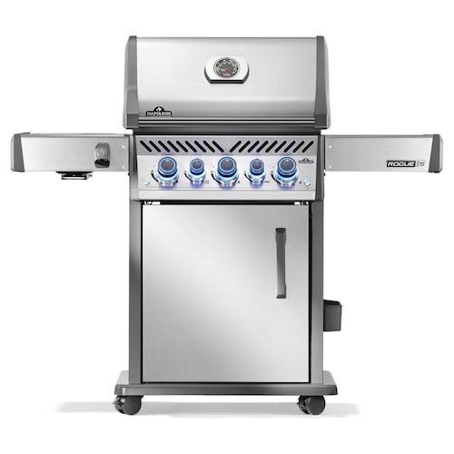 <h3>The Napoleon Rogue SE 425 RSIB Propane Grill: Going Rogue has Never Tasted So Good </h3><p>Napoleon put a great deal of thought into designing their Rogue series of gas grills. They packed performance into an eye-catching form and created freestanding grills with carts that are more than just a stand for a grill. </p><h3>Infrared Rear Rotisserie Burner </h3><p>Perfect for high heat searing and slow spit roasting for succulent roasted meals. (<a href="{pathFor action='category' id='3069838'}">Rotisserie kit sold separately</a>) </p><h3>Large Infrared Sizzle Zone Side Burner </h3><p>Get the perfect steakhouse-quality sear! Napoleon's IR side burner is more efficient and gets much hotter (up to 1,800 degrees F!) than a conventional burner, giving it the power to quickly sear meat and deliver the much-desired caramelized crust, sealing in flavor and juices. With an infrared burner, you're actually cooking with the power of light energy. </p><h3>3 Stainless Steel Burners </h3><p>Burners are the heart of any gas grill. Napoleon's 16-gauge premium 304 stainless steel burner tubes are reinforced and feature an industry-leading design that provides proven longevity, performance, and efficiency. Complete combustion is the key, and these burners balance fuel and oxygen to generate a clean burn. Dual gas ports on the top and sides of each burner ensure even heating along the burner and produced fewer flare-ups. </p><h3>Instant JETFIRE Ignition </h3><p>If a grill doesn't reliably light, it's not a reliable grill. Napoleon's Instant JETFIRE ignition lights the first time, every time. The design sends a jet of flame to light each burner individually. You can light your grill with the twist of your writs. Batteries not required! With cross-lighting burners, in the unlikely event that a burner goes out or fails to light, it automatically relights. There's a cross-light bracket between burners that passes flame to the unlit burner, assuring safe and reliable grilling. </p><h3>High Top Lid </h3><p>The Napoleon Rogue SE 425 RSIB Propane Grill's heavy-duty high top lid pivots on a central point to keep the opening within the same space as the body of the grill. In addition, though the lid is are heavy, the design provides leverage to easily open it. The higher height gives you space to grill larger meats, and the double layer of insulation works to keep the heat in and helps it circulate for greater heat control. </p><h3>Stainless Steel Iconic Wave Cooking Grids </h3><p>Never underestimate the power of heavy-duty stainless steel cooking grids! As you can see, the Wave design is like no other, but it's not just because they look cool. The wave encourages even heating and provides more surface area, prevents food from falling through, and keeps the grill cleaner. The shape increases the grates' longevity by allowing for even expansion and contraction, reducing the effect that heat and cold have on the metal. </p><h3>Backlit Ergonomic Control Knobs </h3><p>Like the feel of a steering wheel, or the knobs of a high-end stereo, the smooth grip and robust shape of the Rogue knobs give you excellent control. Illuminated to prevent the "where do I have everything set?" guessing game after the sun goes down. </p><h3>A Grill Cart that is Much More than Just a Cart </h3><p>The Rogue SE 425 RSIB's cart is functional and offers features not generally found at this price point. The enclosed design protects the contents from the elements and provides long-lasting durability. Each cart includes a built-in propane tank ring to secure the tank and improve safety, especially when moving the grill. There are tool hooks on each side shelf to help you keep your grilling tools within reach without cluttering up the stainless steel folding shelf, and a condiment basket to store your favorite spices and sauces. The cart rests on locking casters for extra stability. Because we can't live by food alone, they've included a bottle opener!</p>