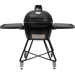 Choose Primo and experience the best in kamado style charcoal cooking. The Primo All-In-One Oval Junior Ceramic Kamado Grill With Cradle & Side Shelves is a medium to large size grill with all the benefits of the original, uniquely shaped Oval XL, but for those who do not need as much cooking area. The distinct shape of the Oval Junior allows you to cook using direct or indirect heat, expanding your grilling options unlike any other kamado-style grill. This grill features easy to clean and reversible stainless steel cooking grates, as well as one of the highest sitting lids on the market which is great for cooking whole chickens. This kamado style grill is made in the USA, unlike its competition, constructed with premium grade Primo SuperCeramics, and coated with a protective, lead-free, and scratch-resistant porcelain glaze. The patented Primo Oval Junior efficiently retains and evenly distributes heat across the 210 square inches of cooking surface, perfect for maintaining a consistent temperature. Smoke meat at temperatures as low as 180 degrees Fahrenheit, or turn up the heat to more than 500 degrees Fahrenheit for searing and grilling. Use the 6-position cast aluminum chimney cap, 5-position stainless steel lower vent door, and easy to read thermometer for monitoring and keeping a precise temperature. The chimney cap also features a hood to keep out rain for all-weather grilling. The easy lift-and-lock hinge system keeps the lid raised in place, now requiring 70-percent less force to open than previous models. A soft-close felt gasket protects the ceramic while opening and closing the lid using the newly designed cool touch handle, now featuring integrated retaining clips to help keep the ceramic top firmly in place. Heat-safe ceramic feet are available to stabilize your Primo and are needed when the grill sits on a combustible surface (sold separately). The variety of accessories available, along with the unique oval shape, allows flexibility in cooking a never ending list of delicious meals. Choosing a Primo kamado style grill is a decision you will never regret. The sturdy metal cradle securely holds your Primo Oval Junior Ceramic Kamado Grill and is the ideal cart for a small yard or patio. Four revolving wheels help you move it around with ease, and two wheels can be locked for stability while grilling. Side shelves made with FDA approved material for food contact, ash tool and grill lifter are all included in this package.
