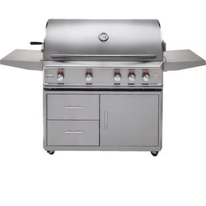 Loaded with the same luxury features of the TRL, the deluxe series turns up the heat with a more powerful cooking system for superior performance. Built completely from 304 grade stainless steel, this grill offers a level of quality usually reserved for commericial style grills. This 44-inch freestanding natural gas grill features four, cast stainless steel burners rated for 20,000 BTUs each. The easy-clean briquette system protects the burners from food drippings, helping to regulate flare-ups. The briquettes are made from ceramics, which offer exceptional heat retention, ensuring the grill maintains even heating acrosss the 1,200 square inch grilling area. The 9mm cooking gates are also made from stainless steel for longevity. Expand your cooking options with the 15,000 BTU rear rotisserie burner. The heavy-duty rotisserie kit can hold up to 50 pounds. The TRLD44-NG also includes a reliable flame thrower ignition with a manual flash tube backup that does not require batteries or electricity. Interior halogen lights and blue LED control knob illumination allow you to grill and entertain in the evening with ease. A large, easy to read temperature gauge is mounted on the hood, and the hood has a double lining, which helps retain heat and potect against heat discoloration. The heavy-duty grill cart features two drawers and one door, folding shelves and locking casters for easy mobility.